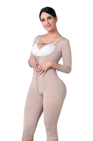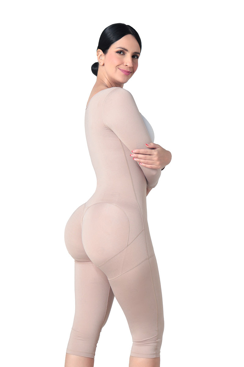 Faja larga primera etapa con manga 3/4 es ideal para la recuperación postquirúrgica, brindando soporte y compresión en áreas como espalda, brazos, abdomen, glúteos y piernas. Diseñada para mejorar la circulación, reducir la inflamación y proteger la piel, esta faja cuenta con un cierre de cuatro posiciones para un ajuste personalizado. Su cremallera en la entrepierna permite mayor comodidad al ir al baño. Además, con su tela de baja compresión hidrata tu piel gracias a microcápsulas de principios activos y vitaminas.